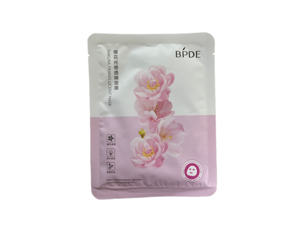 BPDE Sakura Translucent Mask – это тканевая маска с экстрактом цветов сакуры содержит натуральный экстракт сакуры, который увлажняет и питает кожу лица на протяжении длительного времени, устраняет сухость, вызванной плохой окружающей средой и косметикой, улучшает цвет кожи лица, глубоко восстанавливает. Маска глубоко увлажняет, разглаживает морщинки, подтягивает кожу. Увлажняет и разглаживает кожу, снимает воспаления. Рекомендована для глубокого увлажнения всех типов кожи.
