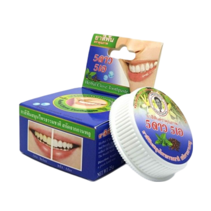 Тайская зубная паста синяя круглая 5 Star для устойчивого свежего дыхания и здоровья десен! Зубная паста синяя отбеливает зубы, устраняет налёт от сигарет, чая и кофе. Отлично борется с неприятным запахом в течении 12 часов! Эффективно удаляет зубной камень, уменьшает чувствительность зубов! Предназначена для гигиены полости рта